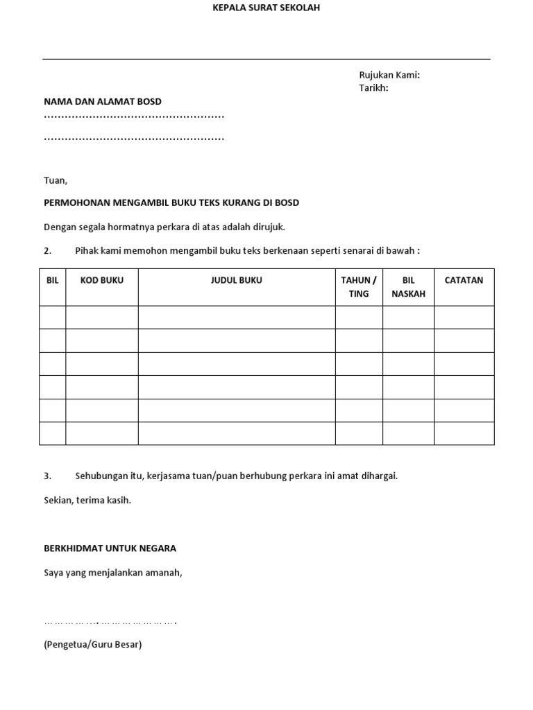 Surat Permohonan Mengambil Buku Teks Kurang Di Bosd Docx