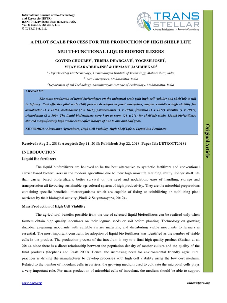A Pilot Scale Process For The Production Of High Shelf Life Multi Functional Liquid Biofertilizers Growth Medium Colony Forming Unit