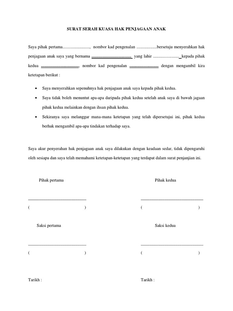 Contoh Surat Serah Kuasa Hak Penjagaan Anak