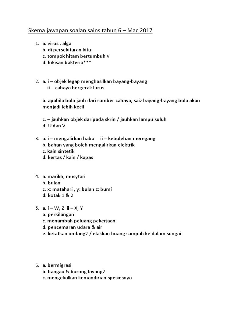 Skema Jawapan Soalan Sains Tahun 6
