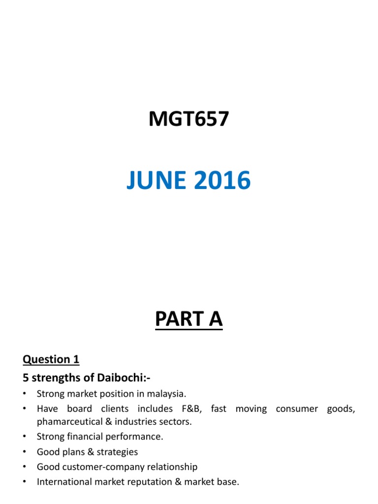 Mgt657 Past Sem Pdf Mgt657 June 2016 Part A Question 1 5 Strengths Of Daibochi U2022 Strong Market Position In Malaysia U2022 Have Board Clients Includes Course Hero
