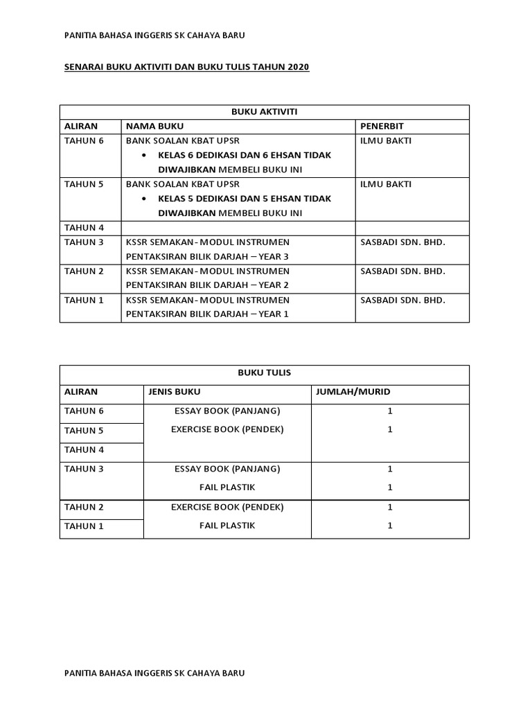 Senarai Buku Aktiviti Dan Buku Tulis Tahun 2020