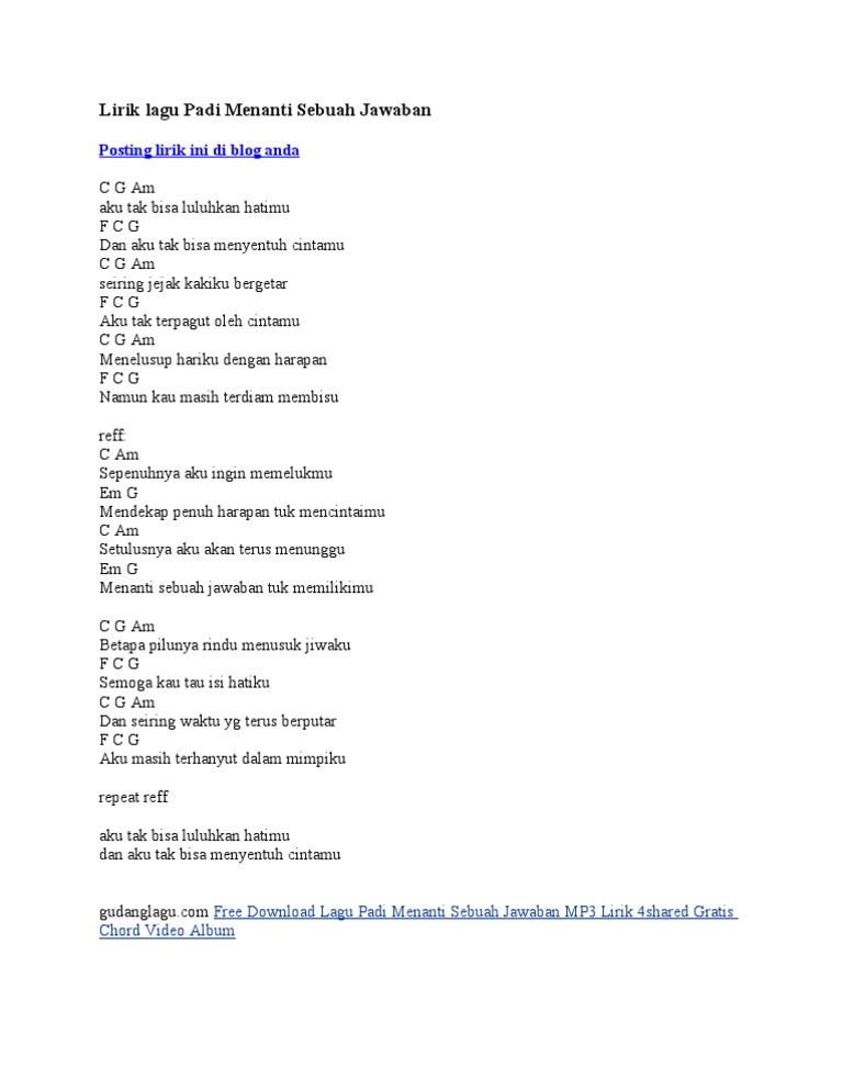 Lirik Lagu Padi Menanti Sebuah Jawaban Chord Kunci Gitar Llckg