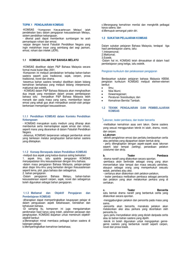 Topik 1 Pengajaran Komsas 1 1 Komsas Dalam P P Bahasa Melayu