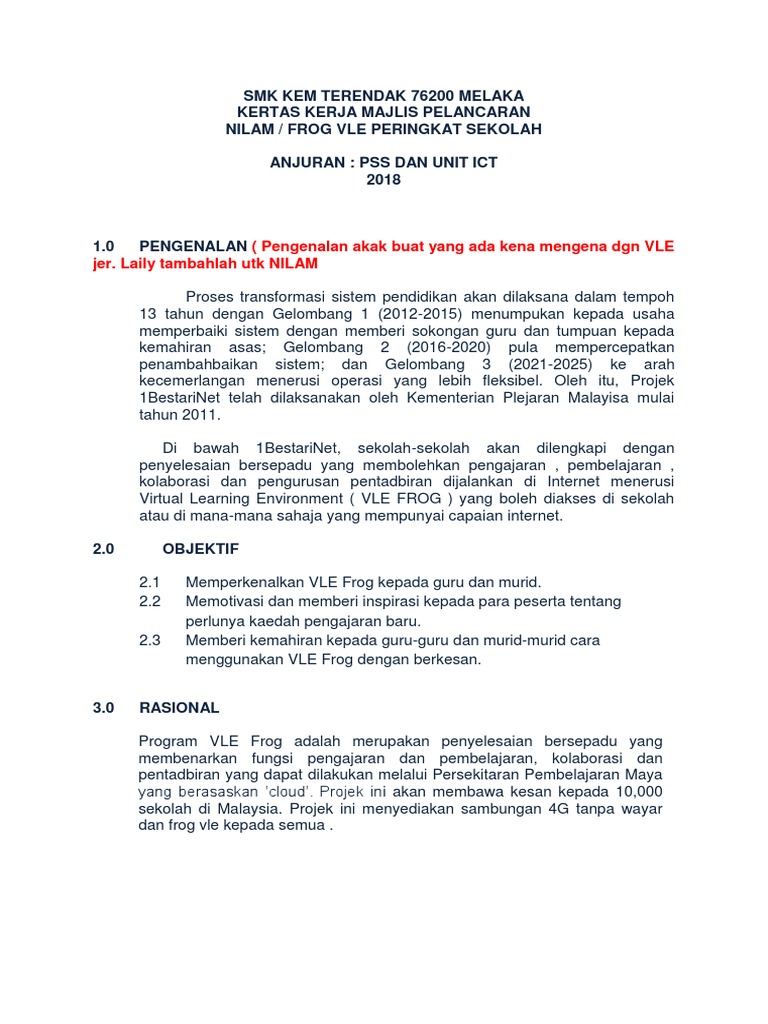 Kertas Kerja Pelancaran Frog Vle Nilam 2018 Smkkt