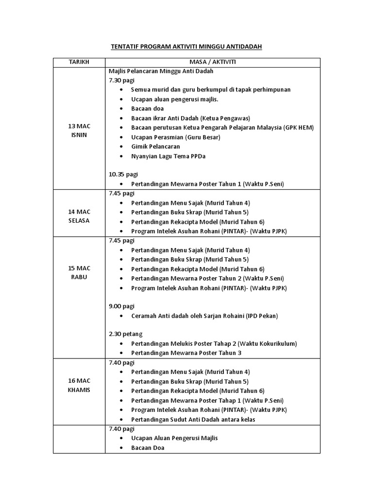 Tentatif Program Aktiviti Minggu Antidadah