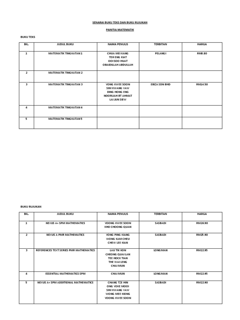 Senarai Buku Teks Dan Buku Rujukan Panitia Mate