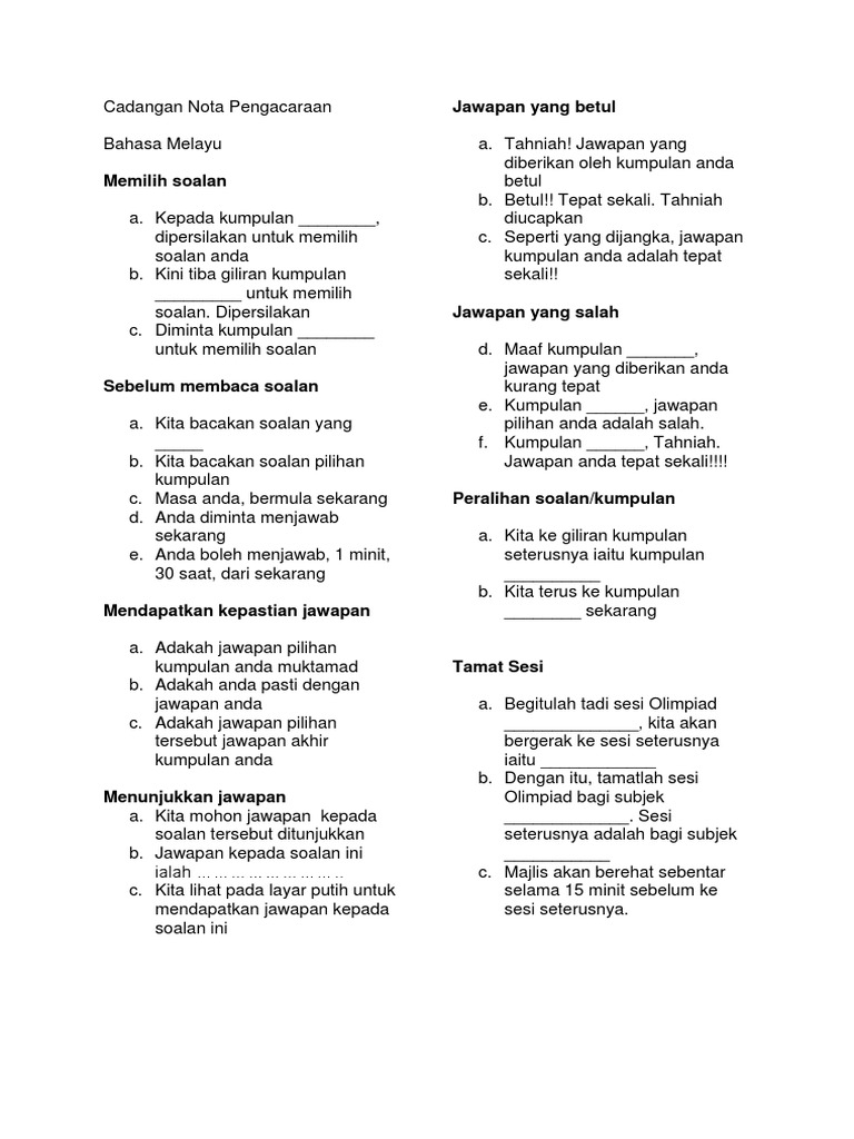 Cadangan Nota Pengacaraan Jawapan Yang Betul