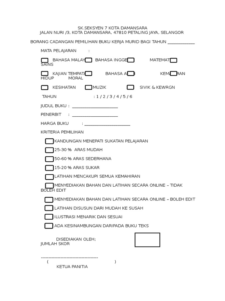 Borang Cadangan Pemilihan Buku Kerja Murid