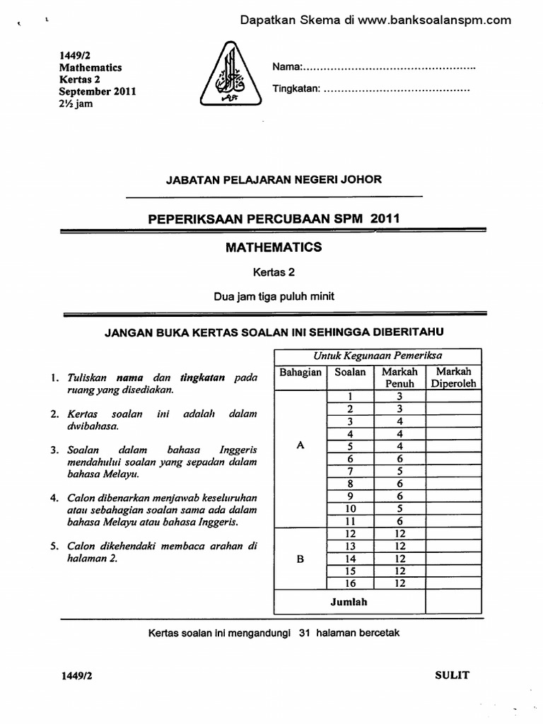 Contoh Soalan Matematik Spm Dan Skema Jawapan Johor