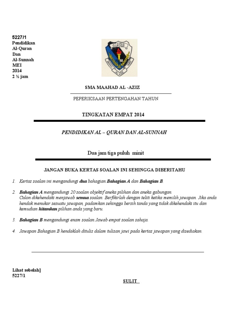 Contoh Soalan Pendidikan Quran Sunnah Tingkatan 4 Tersoal O