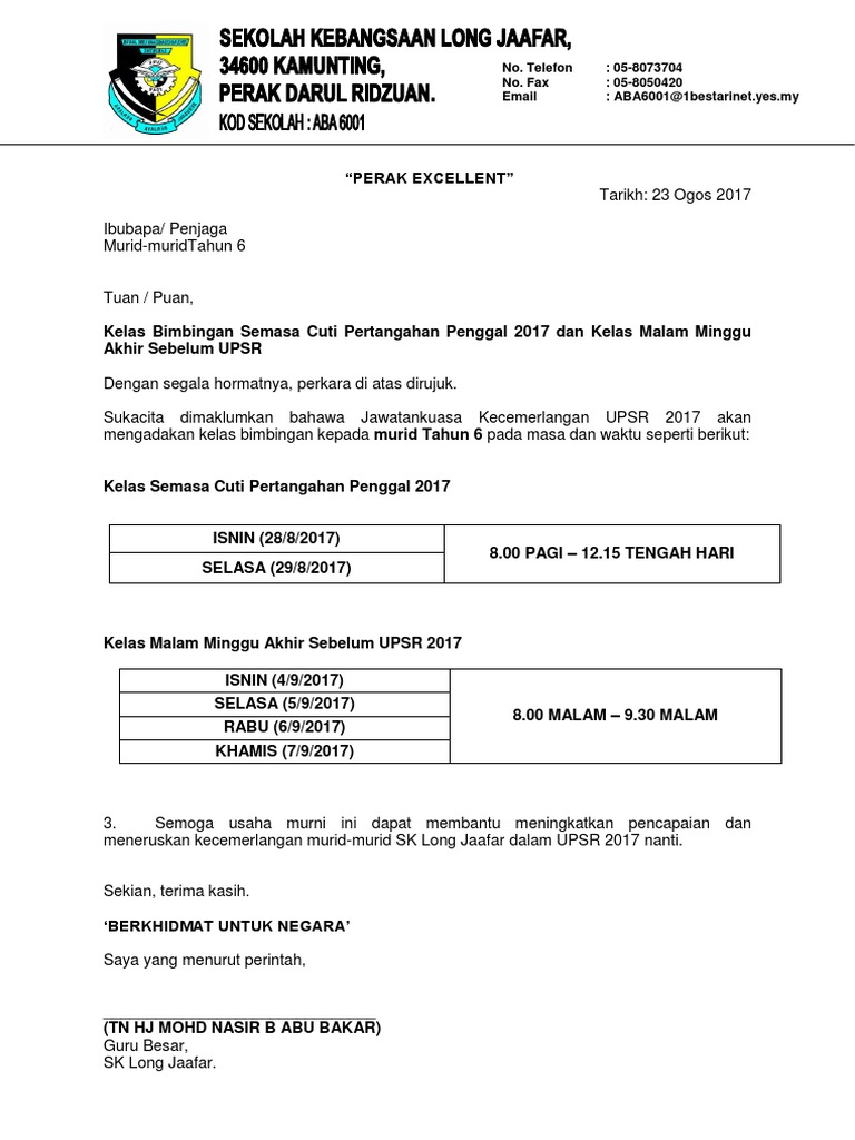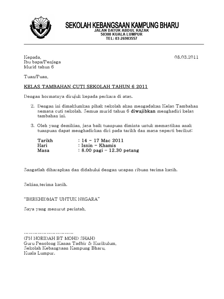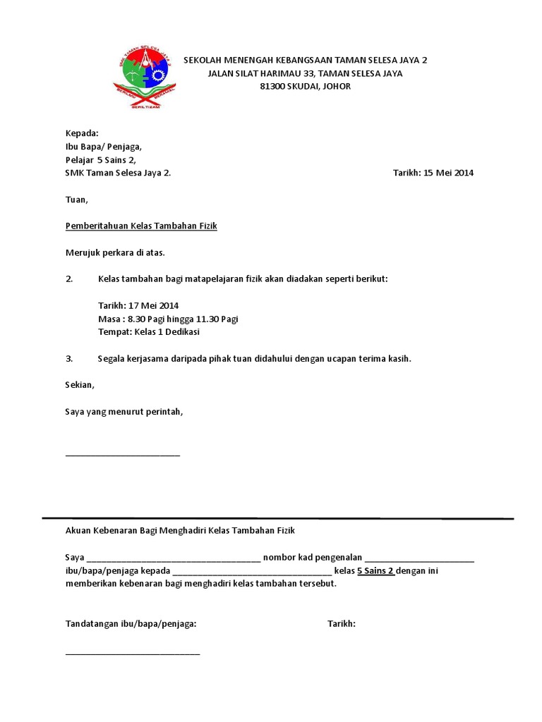 Contoh Surat Makluman Aktiviti Kokurikulum Kepada Ibu Bapa Contoh Surat