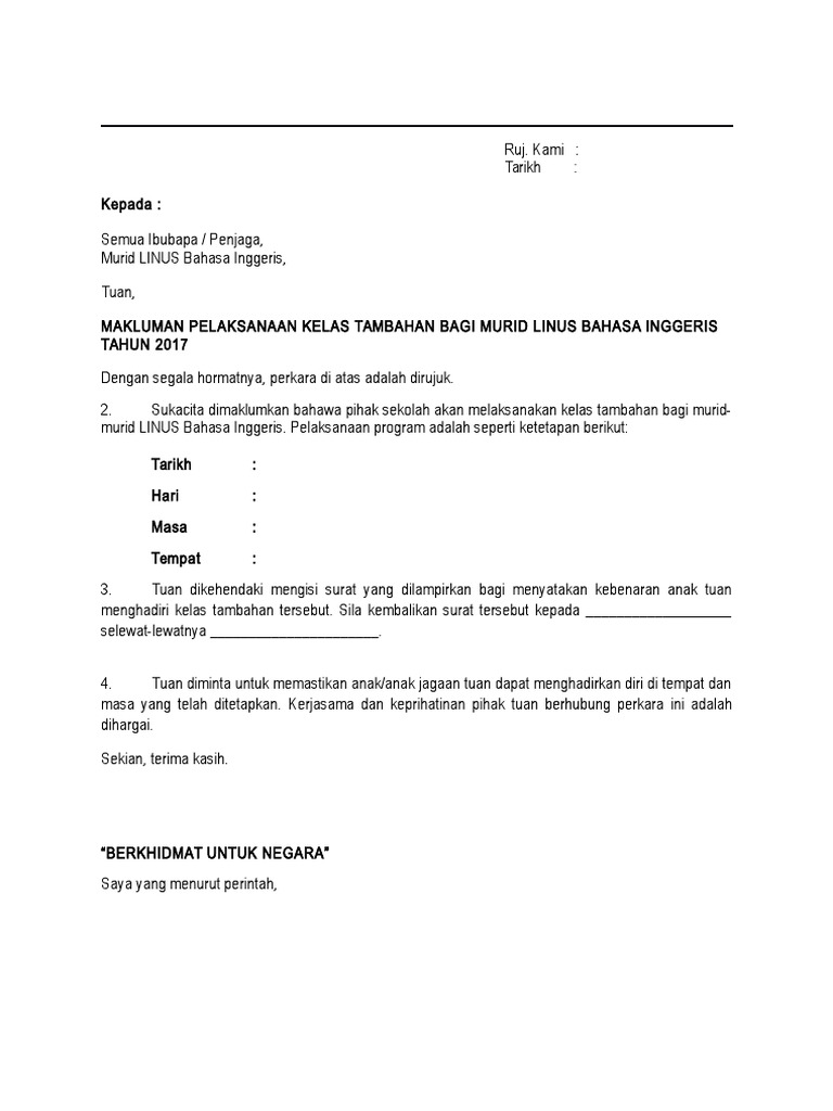 Contoh Surat Makluman Kelas Tambahan Linus