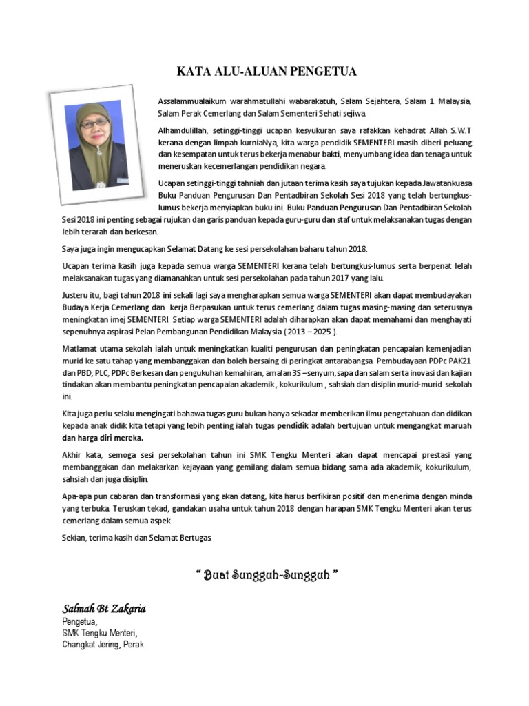 Kata Kata Aluan Pengetua Buku Pengurusan 2018