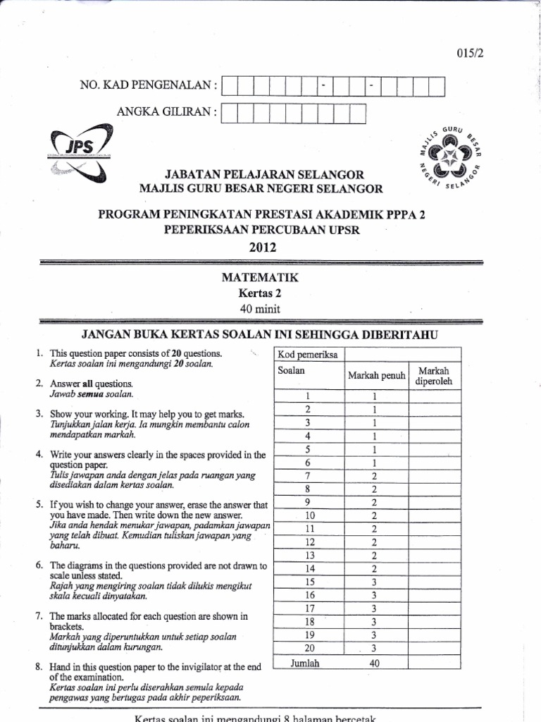Percubaan Matematik Kertas 2 Upsr 2016 Selangor