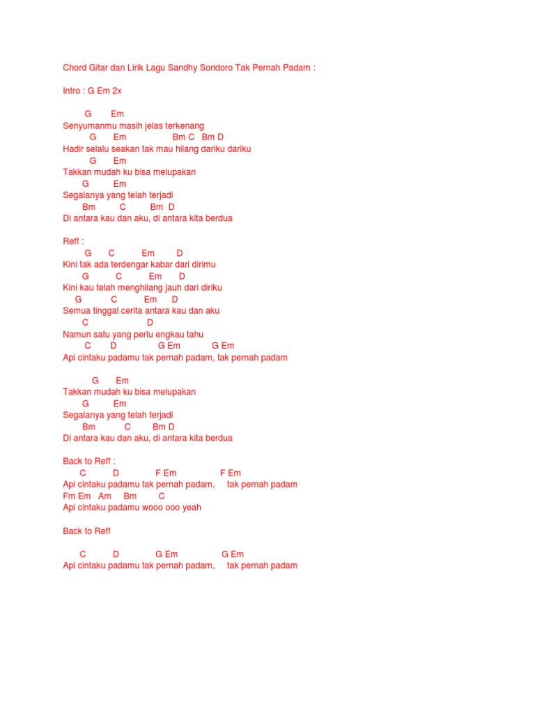 Chord Gitar Dan Lirik Lagu Sandhy Sondoro Tak Pernah Padam